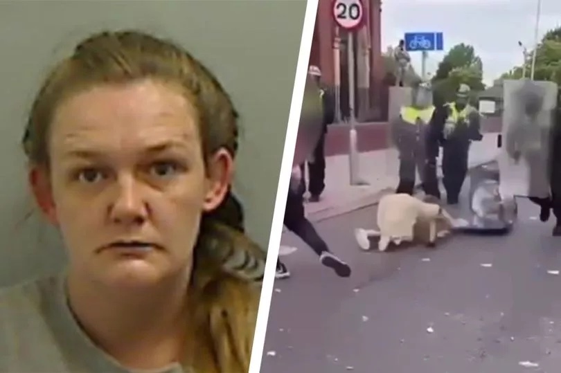 A mum-of-five who pushed a lit wheelie bin at a line of police during the Middlesbrough riots, has been locked up.