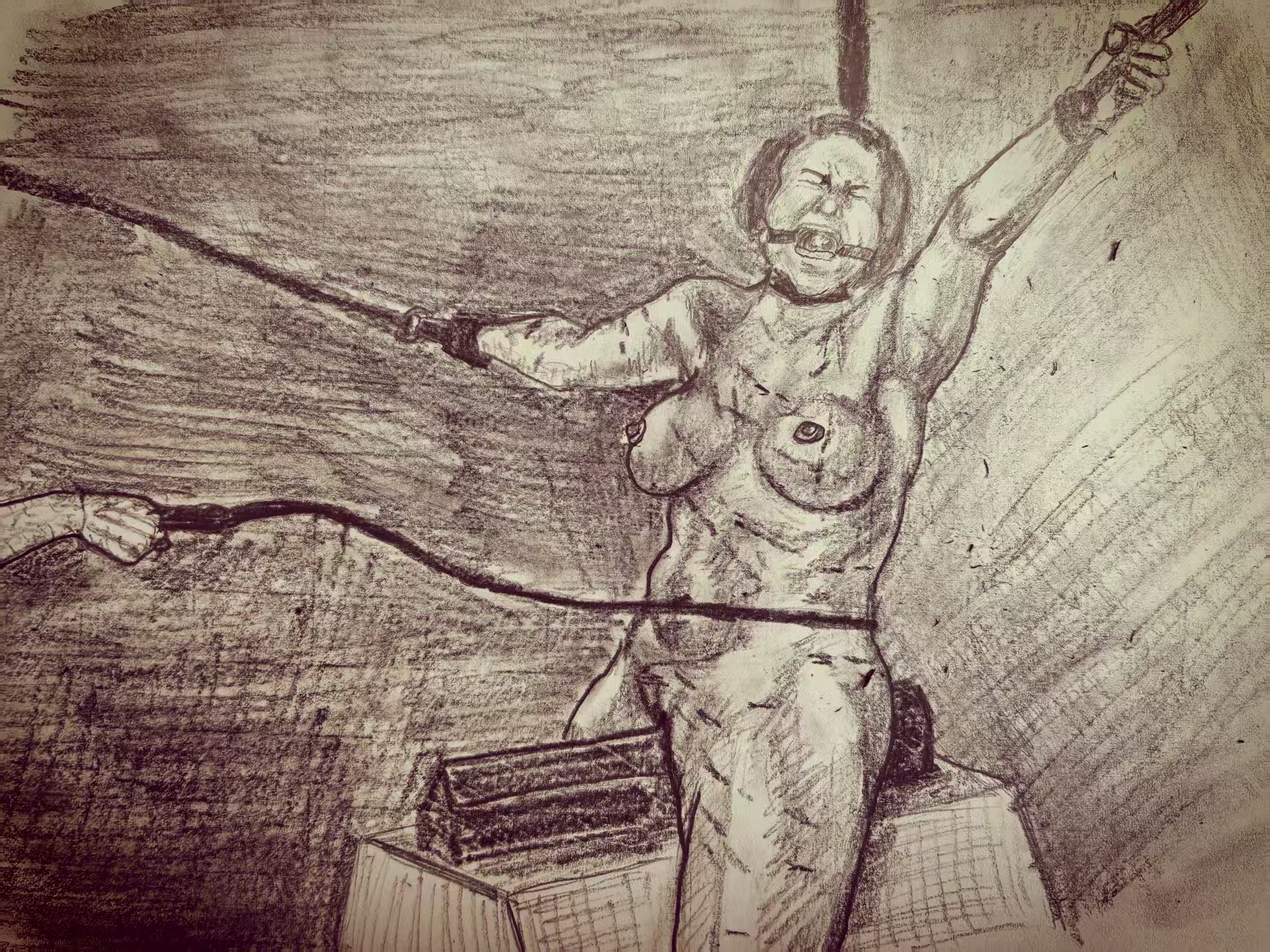 Whipped on the bench and then impaled with a wood-burning tool