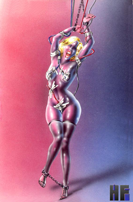 The way the cables are taped to her body making it virtually impossible for her to pull them free - the AOH chains preventing her from pulling down on the cables - her feet dancing on the floor, unable to control herself as the juice hits her - the mouth wide open, screaming in pain, begging, for mercy, pleading with her captors for relief from her ordeal.