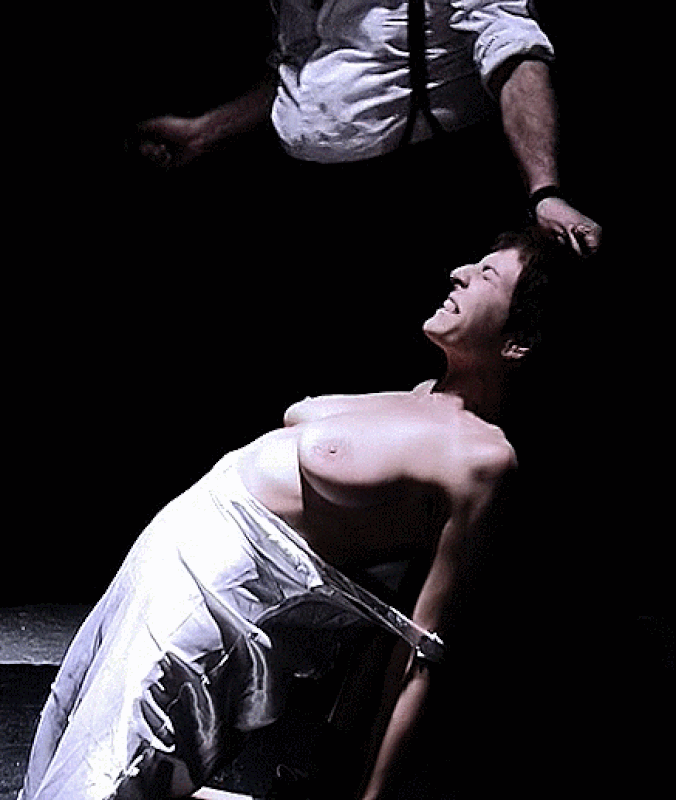 Inmates in women's prison are made to wear 'smocks' that can easily be manipulated or in some cases removed to carry out corporal punishments such a s flogging or canning. In this instance it is moved down for a breast beating,