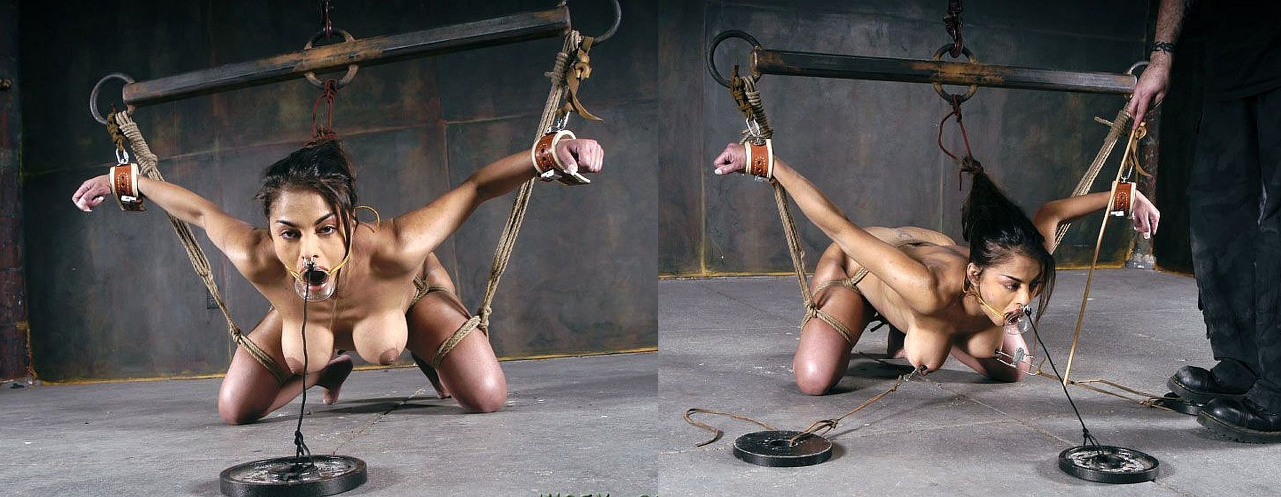 What an ordeal - legs spread nice and wide, the ropes around her breasts tied up high and the ass hook force her to keep her back arched. Despite the pain in her back she has to maintain position - if she weakens, both the ropes around her tits and the ass hook tighten!