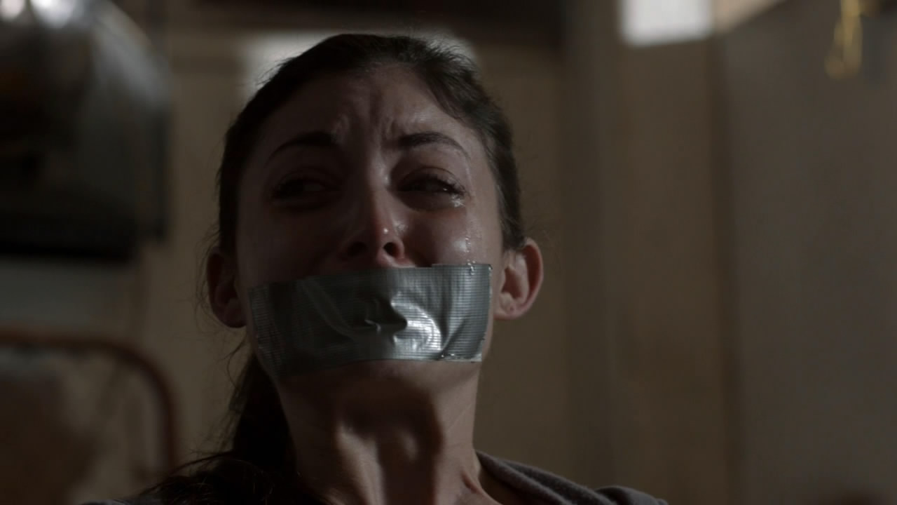 Beautiful Ashton Leigh is gagged in a “Breakout Kings” episode (season 2, episode 6). I love the abject fear she exudes… she seems genuinely terrified. Fantastic sounds coming from behind that gag.