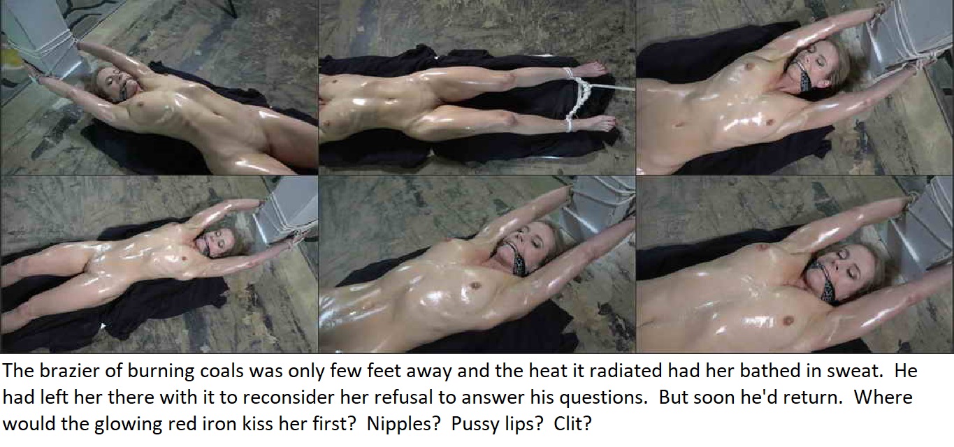 2) Love the way she's been stripped completely naked with her arms locked behind her back and her legs spread - her breasts and vagina completely exposed - she's completely helpless, vulnerable and humiliated