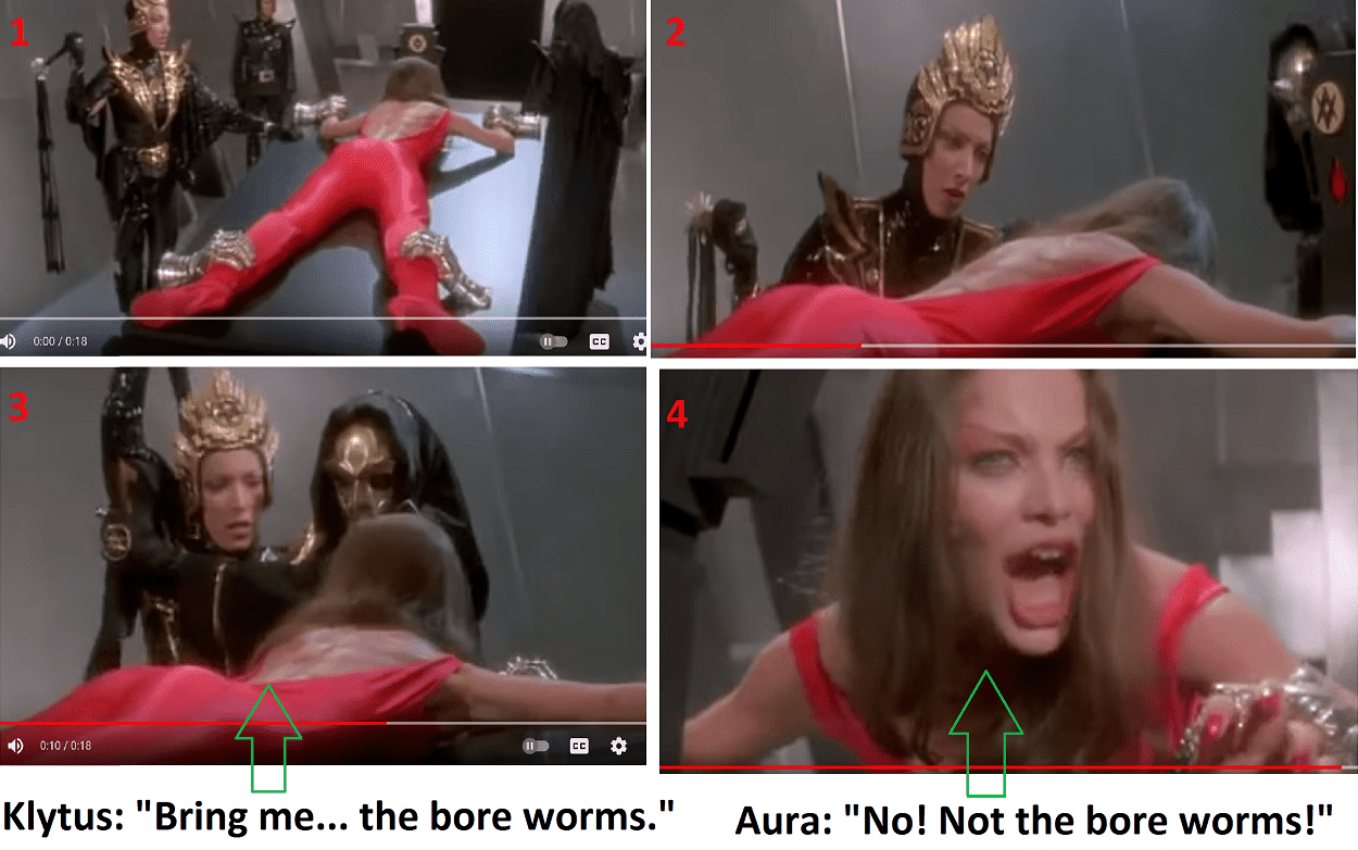 - Aura is not "rescued" but tortured with the boreworms until she talks (not onscreen - she tells it later).