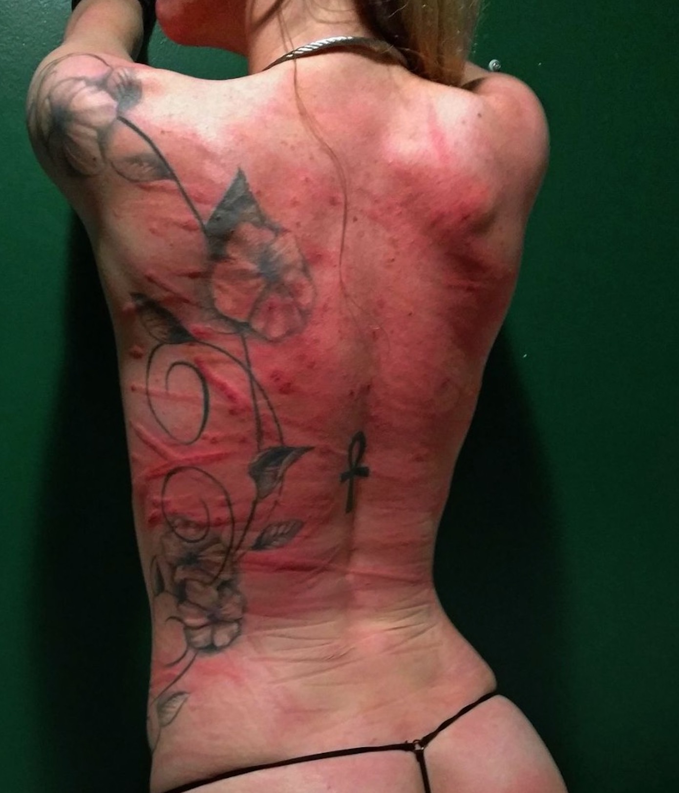 A disobedient blonde bitch displaying the marks of her recent punishment: