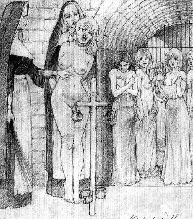 Nuns carrying out some form of punishment (looks like a birching) using some imaginative equipment. This is no doubt for their own pleasure.