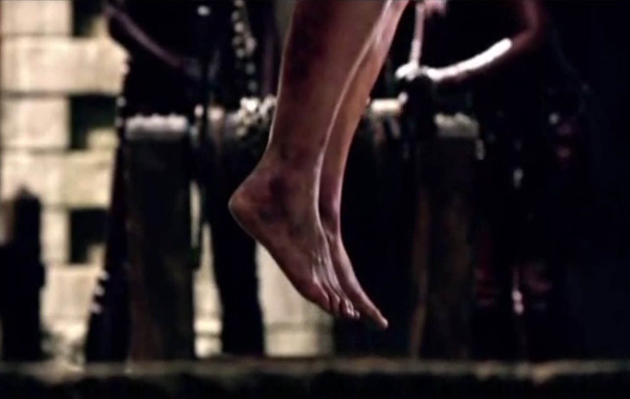 A young woman wearing only black panties is tied spread eagle to a bedframe (sans mattress) by 2 or 3 guys in suits, apparently in preparation for torture of some kind. The scene looks very much like a Latin-American junta setting, the torture room is empty except for the frame and quite spacious.The bad guys leave the room and she writhes and struggles a bit. She is rescued by a knight-in-shining-armor before they return. So the scene is very much a tease, but a very hot one.