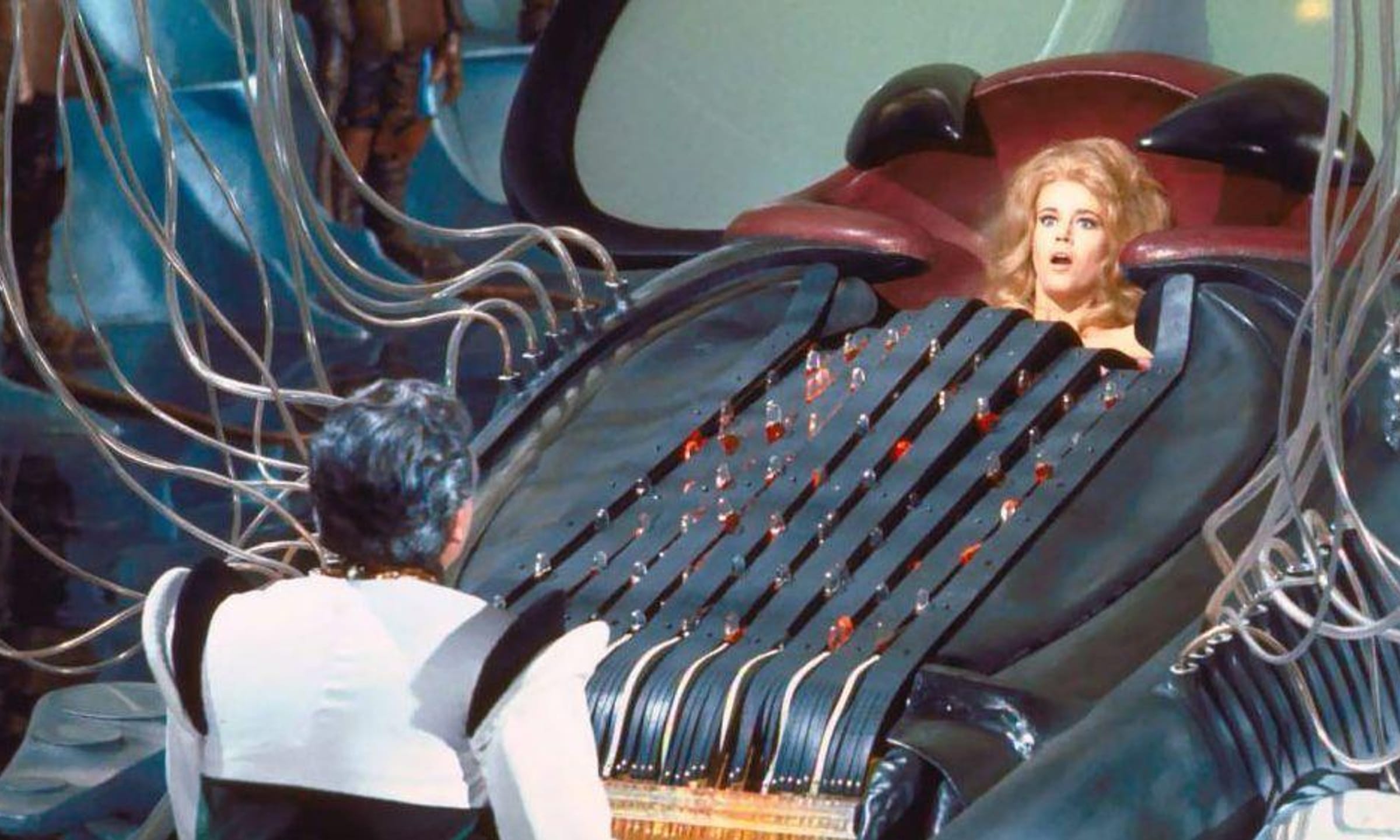 In the midst of Jane Fonda's campy sci-fi cult classic Barbarella, she finds herself a captive of the evil mastermind Durand Durand (Milo O'Shea), who places her in a “torture” device he calls the Excessive Machine. Controlled by an organ keyboard that Durand plays, the device inflicts so much pleasure on Barbarella's body that, he hopes, it will kill her. Fortunately for the brave protagonist, she's able to withstand that much pleasure, and the machine burns out.
