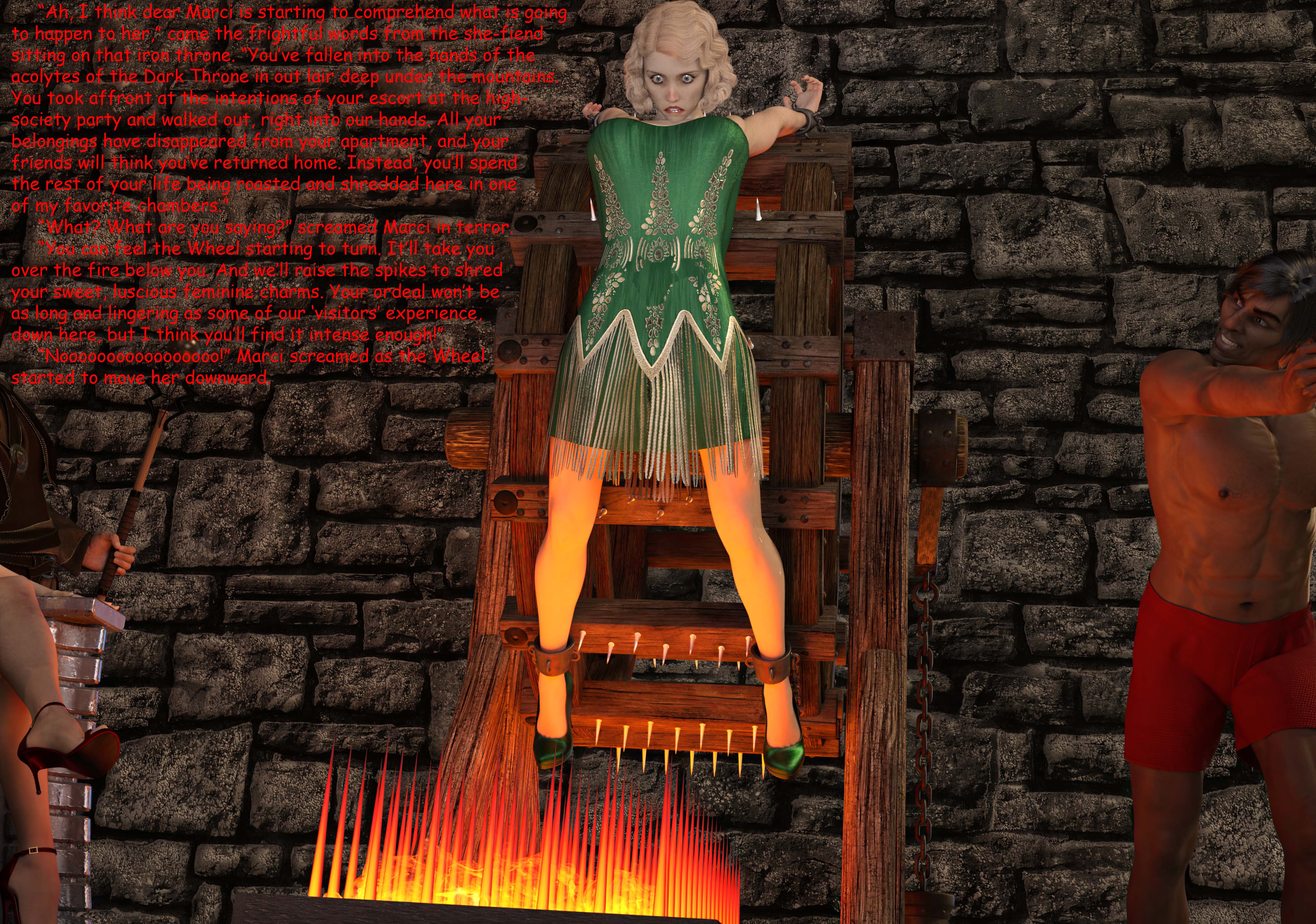 Anyway, I got carried away again and wound up coming up with a mini-story line. It doesn't go too awful far, but it takes several revolutions of the Wheel before my heroine loses all her clothing and starts to get ravaged by the spikes. For those who are interested, stand by (3 images per day, remember).