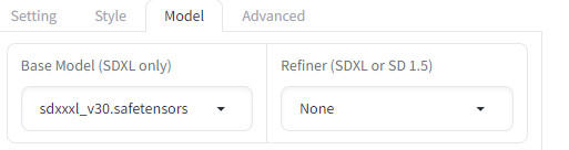 Finally, the place to load them is to click ADVANCED checkbox, then MODEL, and there you enter your base model and the LORA(s). You can use up to five LORAs simultaneously with various degree of strength but only one base model (or checkpoint).