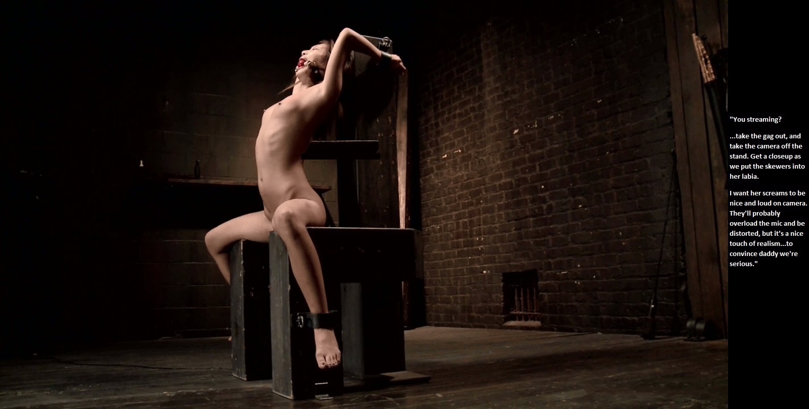 Yes, I realize this is the GIMP Forum, so here is Alina Li for Kink, all strapped up and such. And with her position on the "chair" it's easy to imagine rape as part of the menu. After they removed the skewers, that is. :P