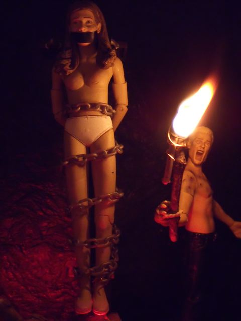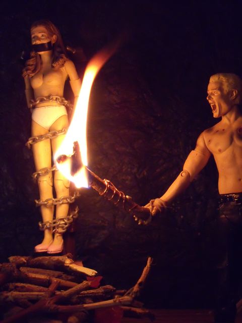 I have a friend named Cannon who collects female action figures, ties them up and displays them in his own little torture dungeon. It's really quite amusing. For a while, I gave him his own section at this site. To thank me, he asked if I would like any custom pics taken. I had one request...can you take some burning at the stake pics with Michelle Trachtenberg? He obliged. Here's a few of them.