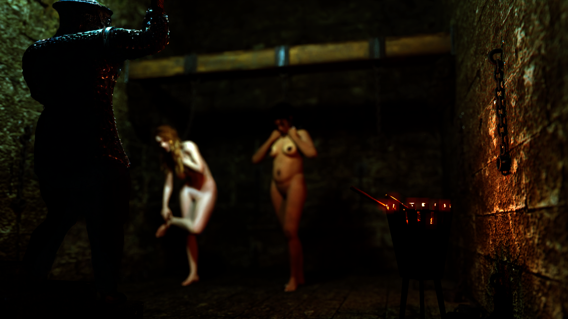 But now, they have to please the large Saracen who is coming downstairs. The Saracen towered over them, his eyes narrowing as he looked down upon the two naked women. "You are both prisoners of war," he said gruffly. "I have taken you for myself."