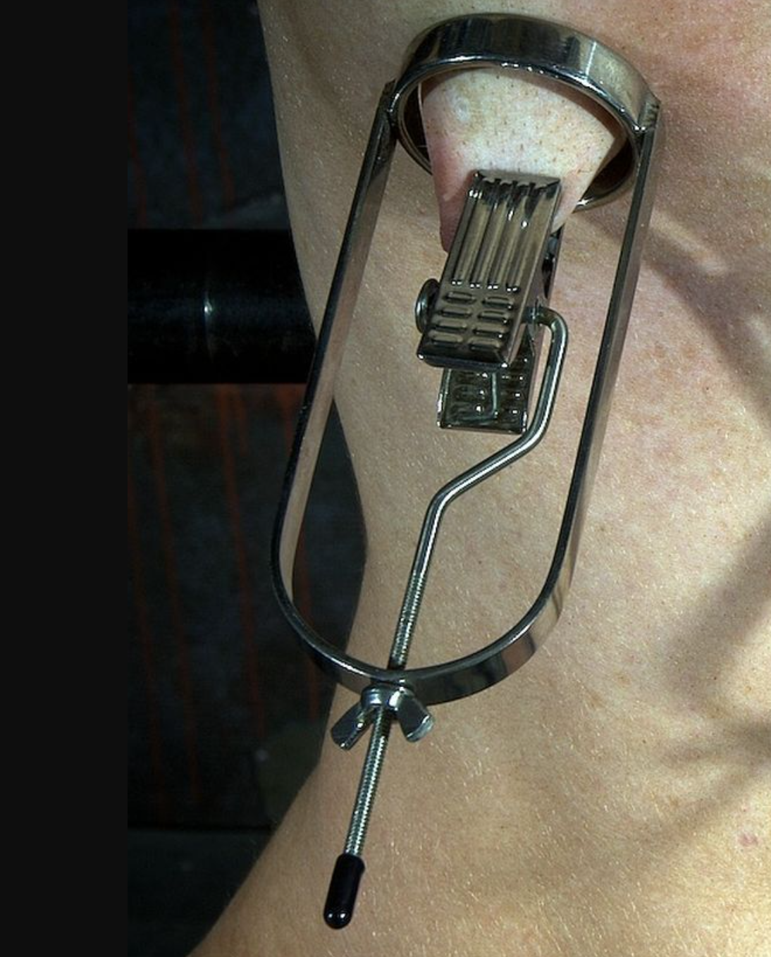 I do have something like this in steel that I had to get made (Very narrow so there is enough flesh to pull through, taller to give strength.) The pain is intense as the edge is so narrow, focused. I'm bruised for 3-4 weeks minium, and haven't used them in a while. Not thought to incorporate a nipple-noose like that (Clamps usually). Will have to ponder this for the next time I really deserve it.