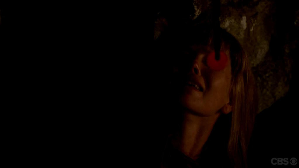 An attractive blonde mother (Sarah Jane Morris) and her young daughter are captured by a modern-day witch hunter and seated on a dirt floor with their wrists tied in front of them. The man takes a branding poker out of the fireplace and orders her to confess to witchcraft, thrusting the glowing poker toward her face. But she quickly makes up a false confession and stops him before he can burn her. A trip to the stake awaits her afterward, but that, too, get thwarted. Ultimately just a big tease.