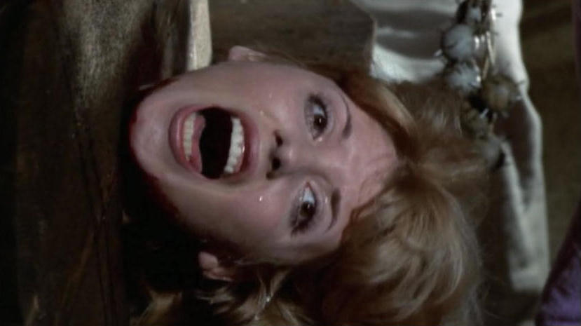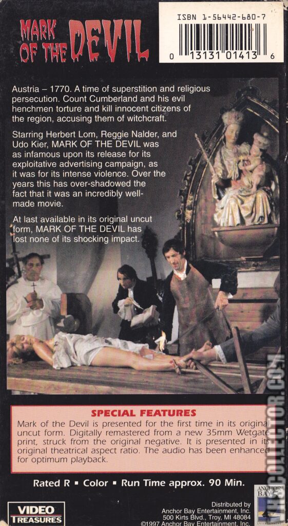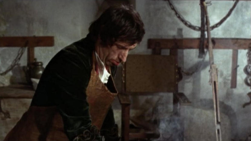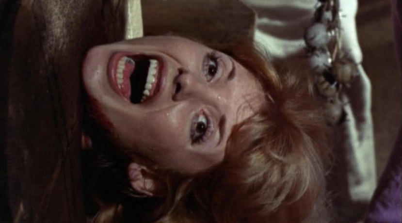 This often is said to be the nastiest of the slew of historically set witch-finder films released in the late 1960’s and early 70’s. As expected, the obligatory hot iron scene does not disappoint. In the longest of several torture sequences, a nude and bloody Gaby Fuchs is stretched on a rack while being grilled by no less than five inquisitors. One of them uses a flaming brand to burn a cryptic array of letters into the sole of her foot. Gaby reacts with wide-eyed agony and screams her confession before being subjected to further torments. VIDEO LINK