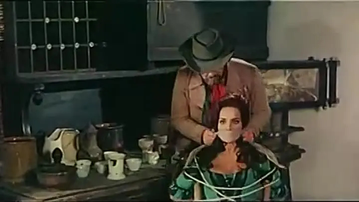 This is an Italian western comedy. Fleurette (Agata Flori) is captured by the leader of the thugs. We see her she bound to a chair and threatened to be branded on the face by the thugs, but their boss arrives to stop it. I’ve never found this movie anywhere.