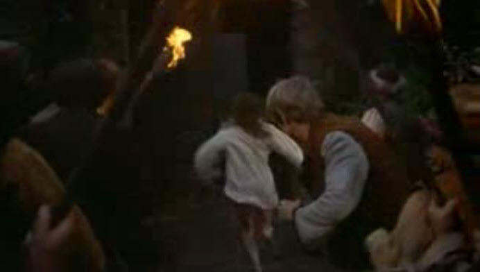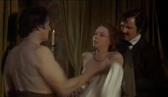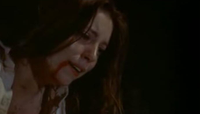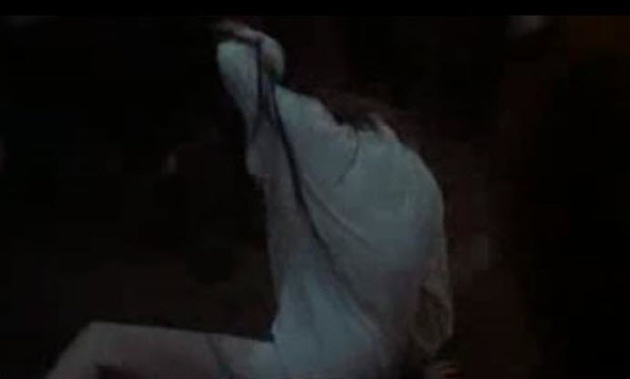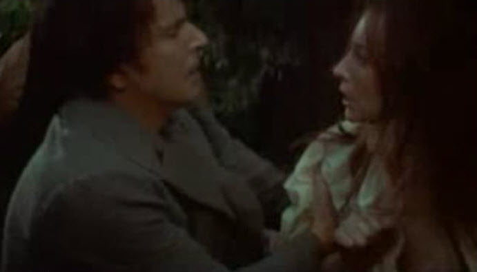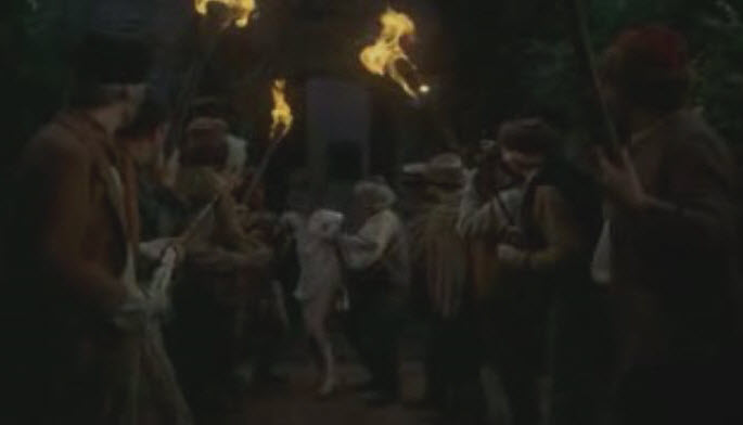 After the villagers storm the castle and kill The Count, they capture Anna (Domini Blythe) for consorting with the vampire. Although she’s beautifully naked when taken into custody, they give her a shirt to wear (!). They take her outside and force her to walk, then crawl, between two rows of villagers who thrash her with whips, belts and tree branches. Unfortunately her husband takes pity on her and saves her. She spits in his face and runs back to the castle. As she flees, we see that there are no marks on her. But later, in the castle, she shows bloody marks on her face and the back of her shirt. The whipping itself is very brief and the angles are not ideal.