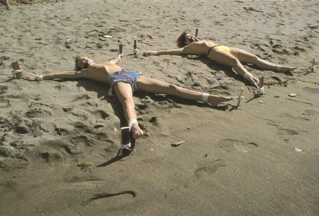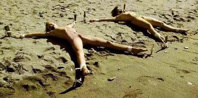 "This is where you are to meet your rescuers, isn't it?" The senior JSO officer stood over them. "Well, just consider that we have given you a little assistance by making sure that you wait here for your rescue." He moved toward the one on the right and pulled the top of her yellow bathing suit open. He could see that her nipples were hard. She was obviously very frightened. This pleased him. She deserved to be frightened. [See Pic 1] He then walked a few steps to his left to stand over the other, reached down and pulled open and off her sports bra. This one's legs were spread a little more than the first, and this one looked even more afraid than the first. He wondered if the first one was their leader. [See Pic 2]