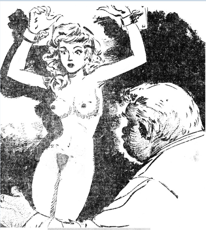 Rhoda and I looked at each other across what seemed like miles of space. It must have become obvious to her that there was no way I could help, no less save her. She managed to stand straight, relieving the strain on her shoulders and arms, but also sending a message to me no matter what they do to me I will be brave. All the other times I had seen Rhoda naked we had made sweet love. This time I would be forced to watch her horribly tortured and listen to her screams before Vallant tired of his sport and killed us both. It was hopeless. Nonetheless, the sight of her chained to the wall, naked and helpless, impelled me to pull in desperation at the straps that held me to the table. There was no give.