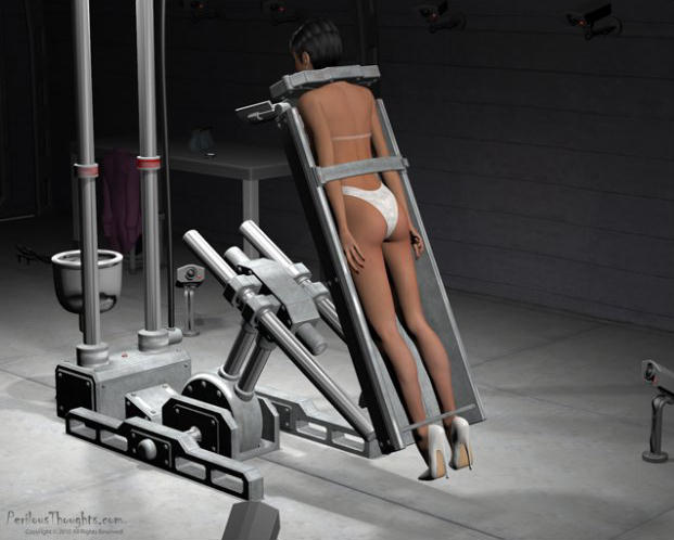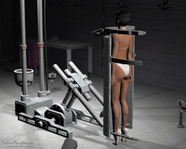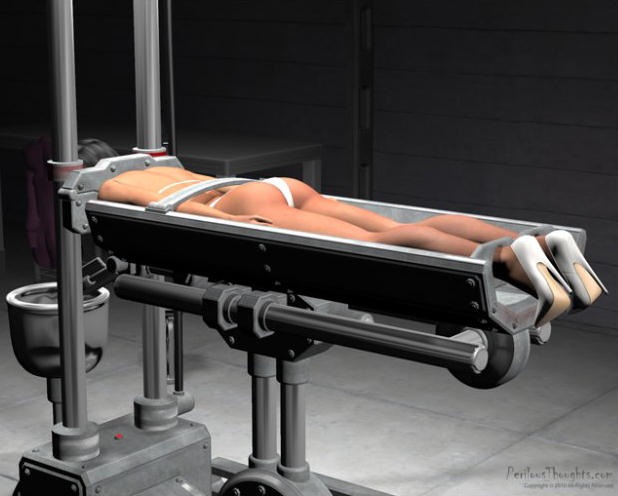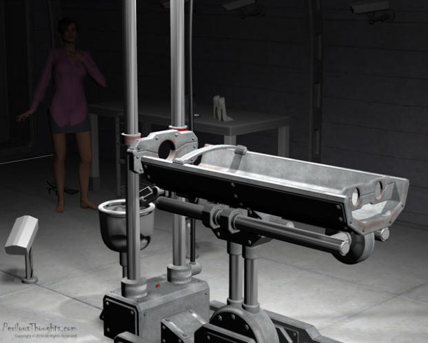 She looked out of the doors of the airlock into the hallway and there was nobody to be seen. She was quite alone. Wanting to take a closer look at the terrible machine, she put her purse and her cell phone on the steel table near the door. She noticed the while high-heel shoes on the other end of the table with at least six inch heels. Quietly, she took off her shoes and left them near the table as she didn’t want to make any noise. She shuddered as she felt the cold granite floor against the soles of her feet. She looked out of the door again to be sure she was alone.
