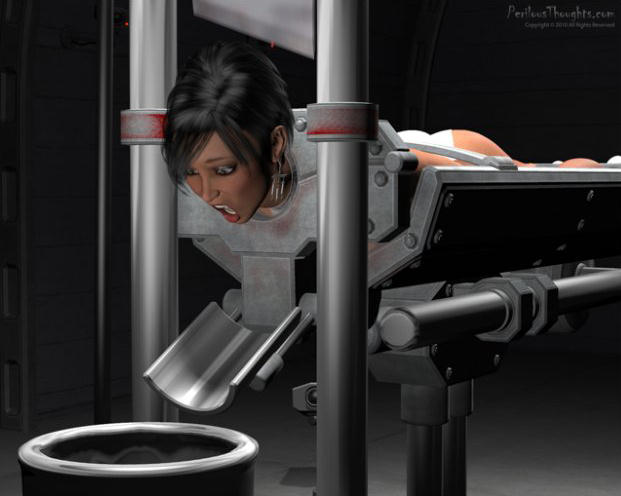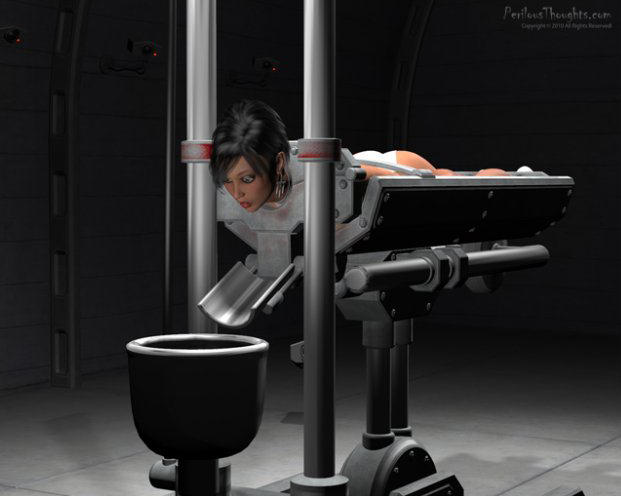 Vanessa tried to struggle against the cold metal restraints which had locked into the side of the bascule with a metallic click. A heavy metal bar with an opposing lunette had closed around the back of her neck so tightly she could hardly turn her head. A metal bar across her back behind her elbows ensured that she couldn’t even bend her arms and kept them firmly pinioned to her sides. The ankle restraints kept her legs perfectly in place and slightly apart. All she could do was stand there in the bascule and wait.