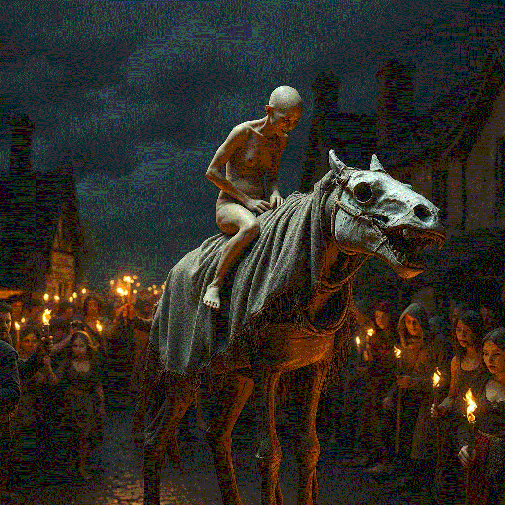 The "horse" began to move, its hidden riders lumbering forward, carrying her through the winding lanes of the village. Her modesty was obliterated, her swelling belly, a shameful testament to her ordeal, horribly on display for every gaping eye. The cacophony of their jeers, their mocking rhymes, their triumphant cries, assaulted her ears.