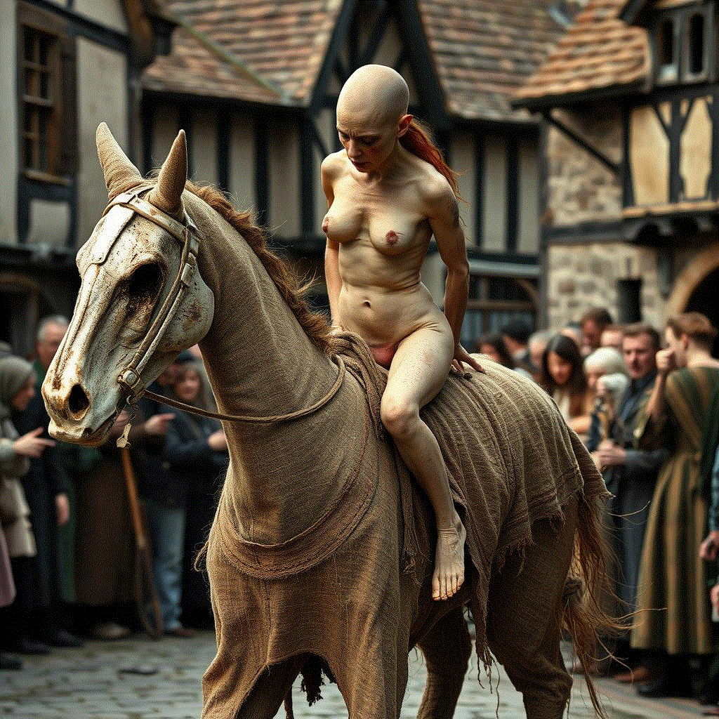 Pelted with all manner of filth, she felt the wet impact of rotten apples and vegetables against her skin, the stinging slap of a dead fish across her cheek. A clod of mud burst against her pregnant belly, leaving a dark, earthy stain. Manure, wet and pungent, splattered on her legs, dripping down onto the crude horse. Her eyes, open but unseeing, were fixed on some distant, unimaginable horizon beyond the baying mob.