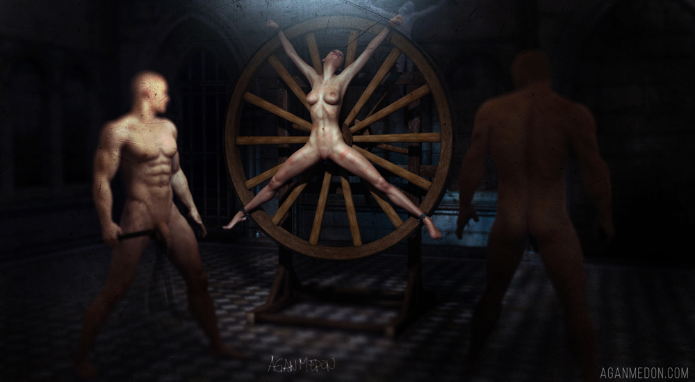 Enslaved lodge's sorceresses and some others, deemed too weak for the hardship of the wheel are sold in the market as pleasure slaves. Each slave is positioned for easy inspection and for tasting the product. Some are resigned with their fate, some are struggling in their stocks. Potential buyers are already parading through the stalls, looking, checking prices, trying the merchandise if they like what they see.