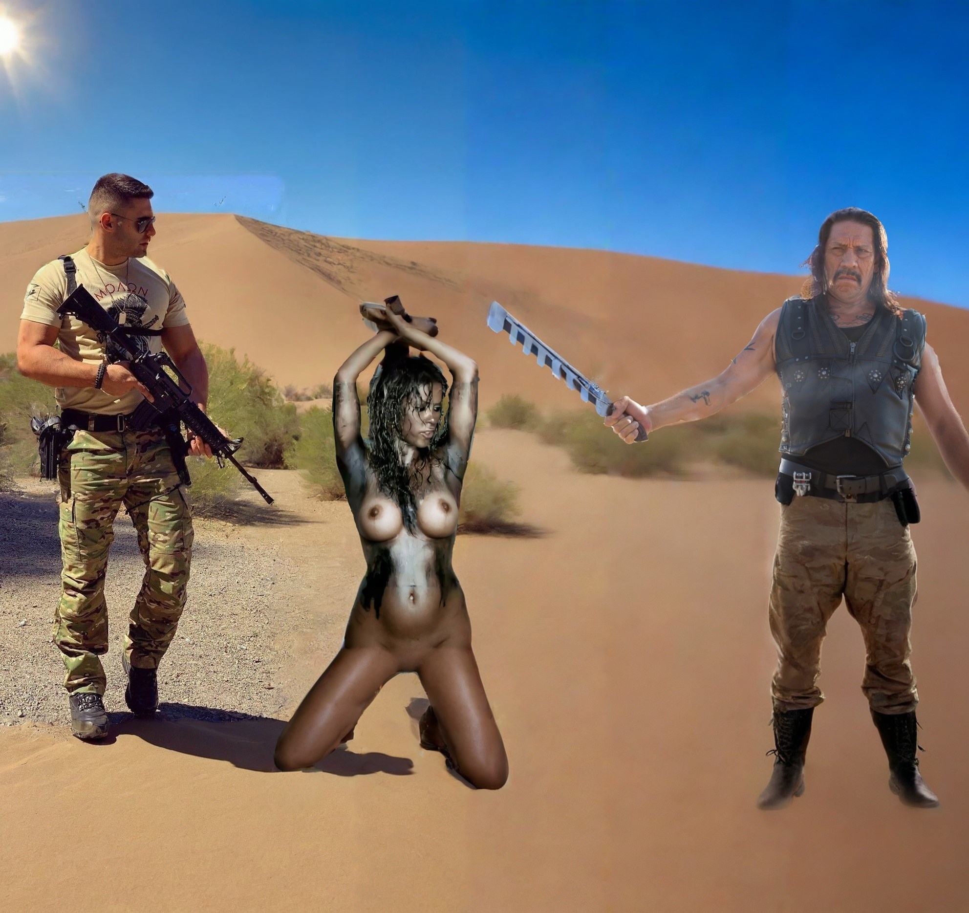 The Medellin cartel found out a cop (suspiciously looking like a famous pop singer) of the special anti-drug unit trying to infiltrate their operations. Undressed and carried into the desert, she now prepares herself to be beheaded by machete.
