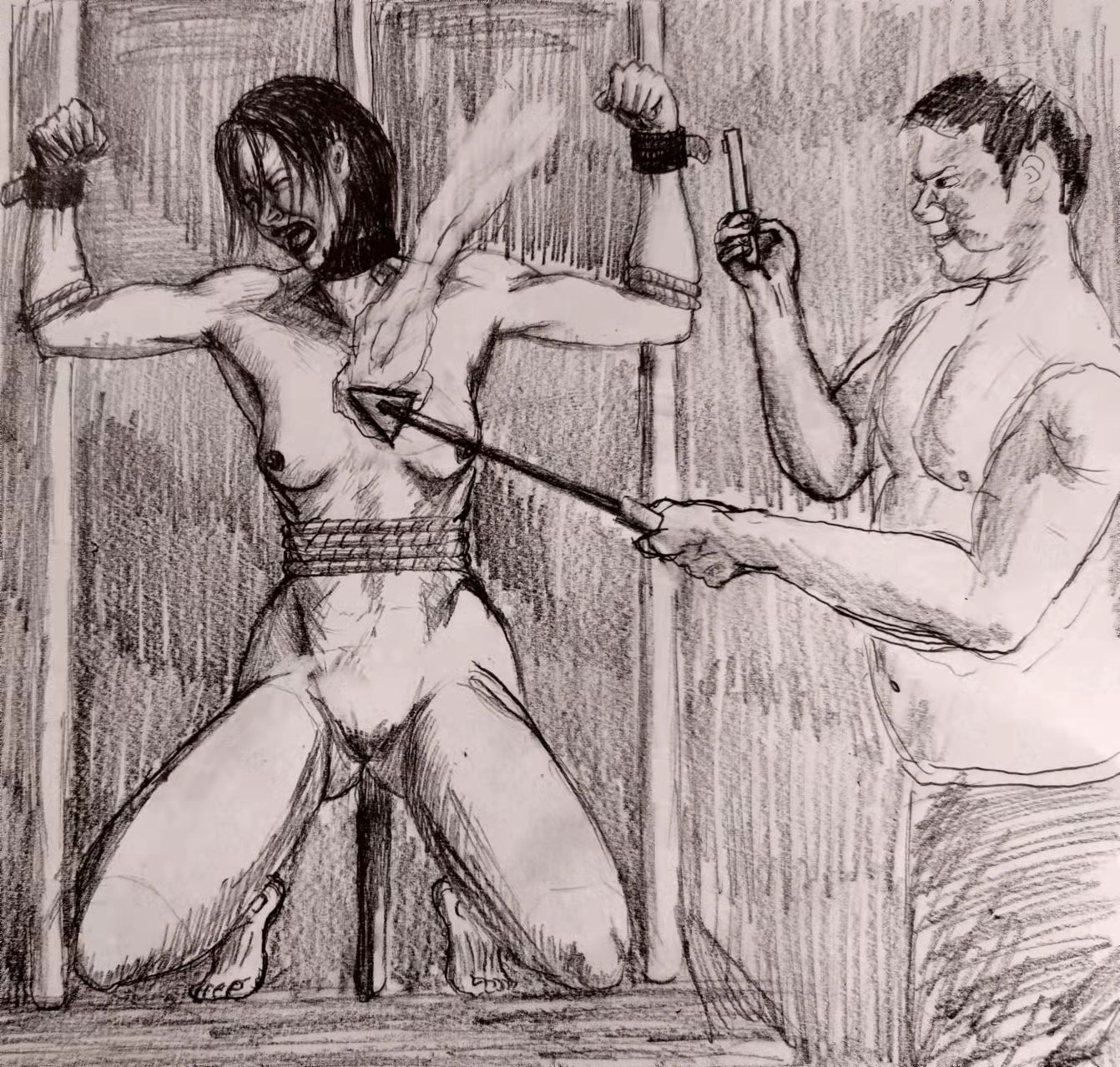 Well done. My personal taste would always be viewed from the other side. I can see the desperate attempt to avoid the burn in her standing spread-eagle (superb position), but no facial expression (except the torturers), no breasts or pussy, no front of the body to see the marking from the iron. I believe you take (and improve) at least some of your images from photos or other images to get started. Perhaps this was such an image. I'd love to see you challenge your imagination. Can you turn it around 180 degrees? I'd love to see what you came up with. You're well on your way to being one of my favorite sources of drawn art!