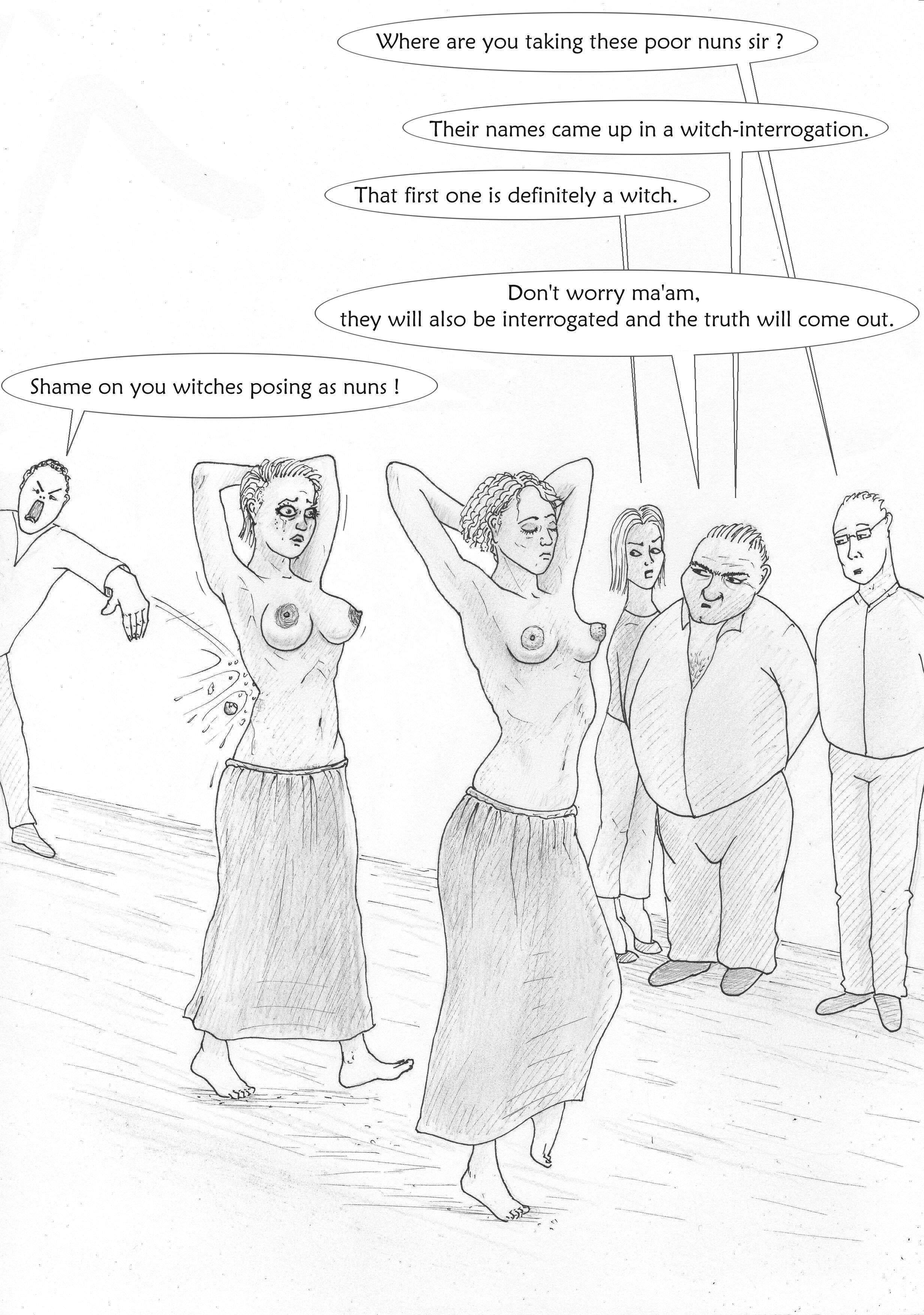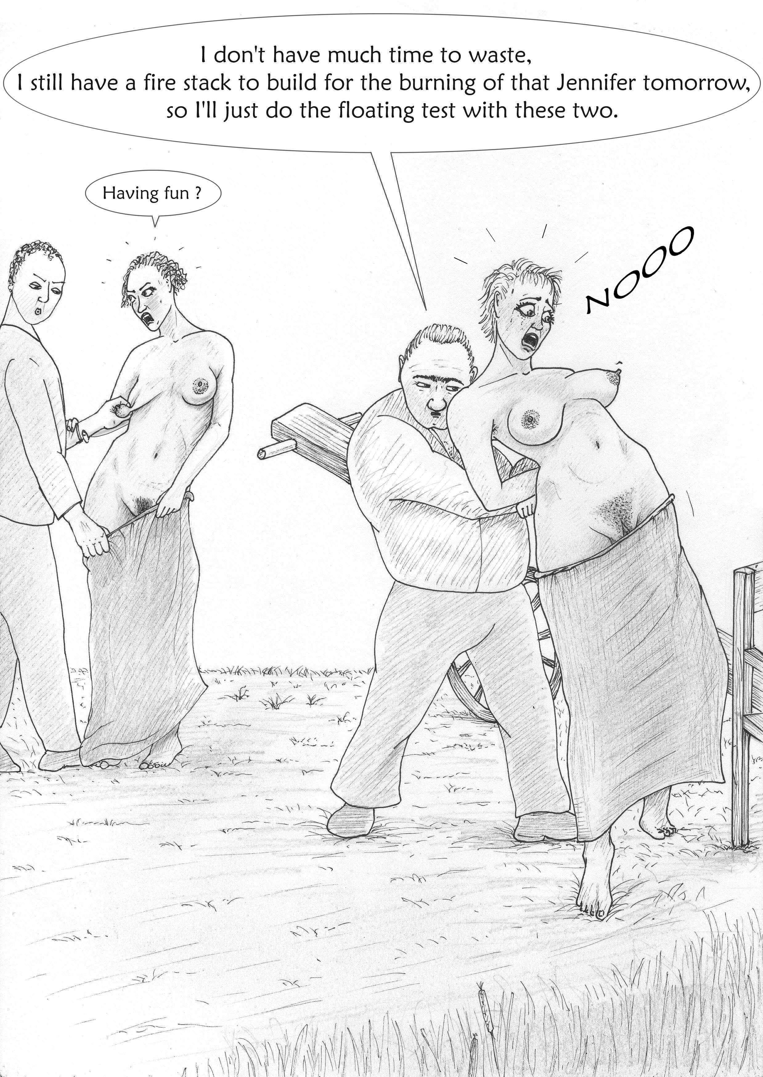 the two nuns are subjected to the water ordeal, either they sink and drown, in which case they are innocent but unfortunately also dead...or they float to the surface, in which case they are guilty and are burned at the stake the very next day together with Jennifer...all brief and yes, also painful, but...no old-fashioned witch interrogation...no thumbscrews, ...no Spanish boots, ...no fine, glowing needles under the fingernails and toenails and in the nipples, ...no glowing skewers through the breasts, ...no small glowing tongs on the labia, ...no more witch's chair with the spiked seat that is heated from below, ...no pulling up backwards (Strappado) initially without but later with weights, ...no racking bench, ...no breast squeeze, ...no more whipping on the back, buttocks, thighs and breasts, ...no glowing devil's penis in the anus and vagina, ….actually a pity…!