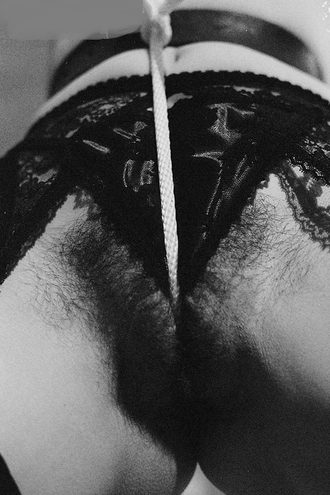 Dixie in the workshop.  Notice the tacks in her crotchrope.....
