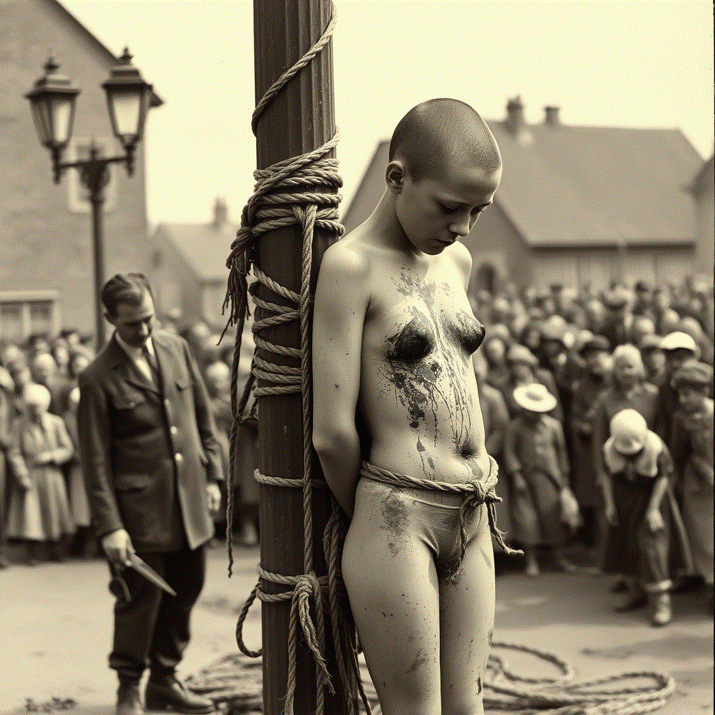This is a historical postcard or souvenir that an allied soldier could send or bring home. It may sound weird, but I envy the blessed unfortunate lady in this picture. I’m afraid it’s rather unlikely, but all the same I hope for her, that she is masochistic and exhibitionistic enough, to secretly enjoy her walk of shame, her social doom – as I do in my fantasies. I wonder in what order the fortunate little traitor was so excitingly shamed. She knew that she had to expect some ruthless ‘purification’ treatment, as the cheering mob dragged her out of the house. I would have been very excited in her place. Would my clothes be ripped off my body, or would I be ordered to strip naked and I would obey knowing that resistance is useless? If I could choose, I would prefer to be forced to perform an involuntary embarrassing striptease. With every piece of cloth that drops to the ground I expose my body more and more until I’m stark naked. I would shiver with agonizing shame and, to my horror, of sexual arousal. The merciless jeers of the mob would increase my shame and arousal even more. Different from the picture I would have to walk barefoot – why should a ‘Nazi Whore’ be allowed to wear shoes? If I may make a wish – I would really enjoy wearing a wicked little accessory: Can my hands please be handcuffed on my back? Oh yes, that feels great! Now I’m perfectly helpless, delivered to the vulgarity of the enthusiastically celebrating mob.