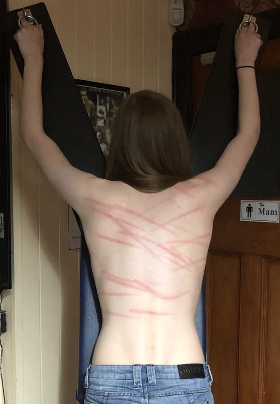 A whipping means punishment. Formal and painful punishment. For me then, an actual whipping has to be on the woman’s bare back. Usually standing and bound to the whipping post or cross, just like in the movies.