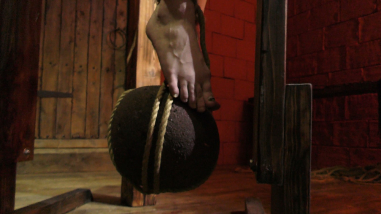 A pretty prisoner, astride the horse in the Cruel World dungeons, with a weight attached to her ankles so that she can truly appreciate her predicament.