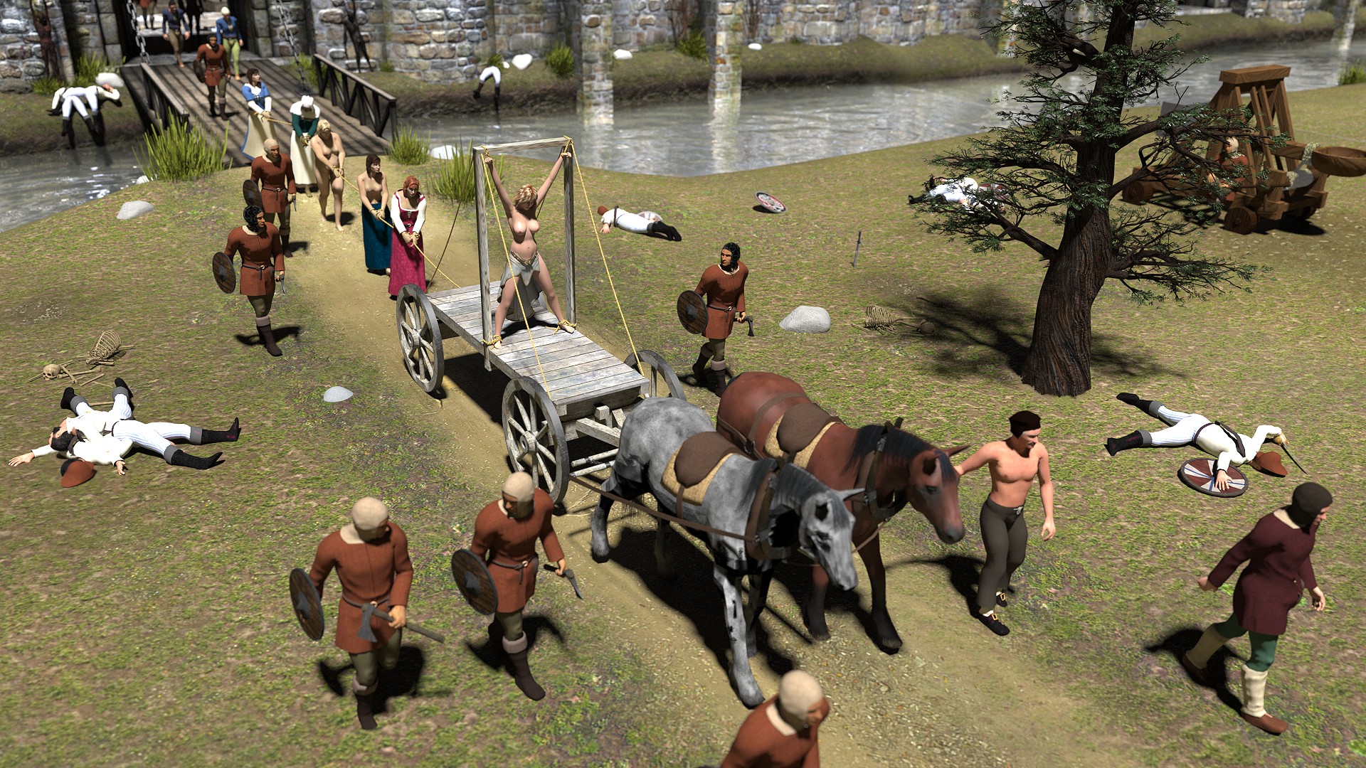 After the fierce battle is over, the soldiers defending the castle were routed. With the her husband killed in a previous battle, the Queen couldn't summon any help this time. So, after ransacking and burning the castle, the Queen is put on display on a cart. Queen Mother, despite her old age is not spared the shame of walking in the victor's parade. Also her sister, topless was tied into the line. The rest of the Royal House staff was part of the human chain that will march to the border.