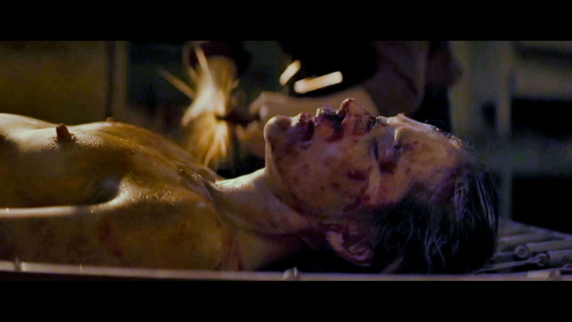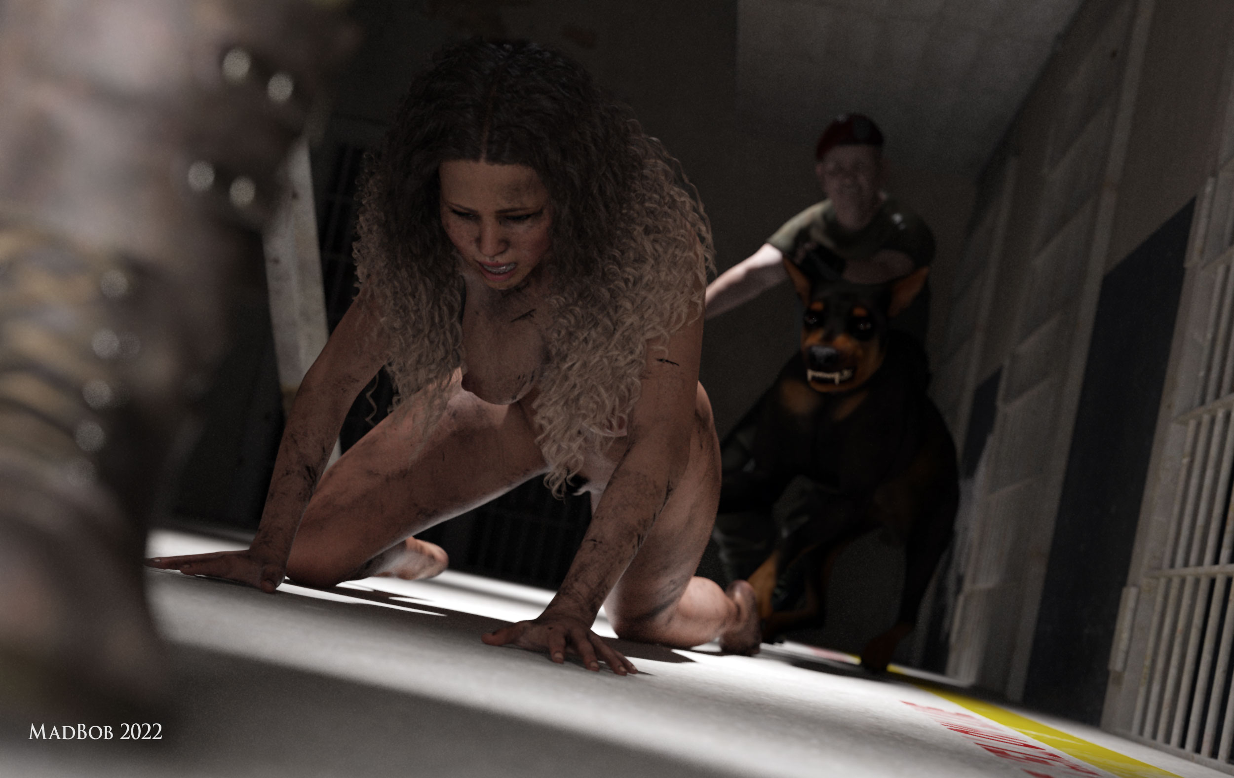 1) she's dazed from recent abuse, note handprints and bruises over her whole body,
