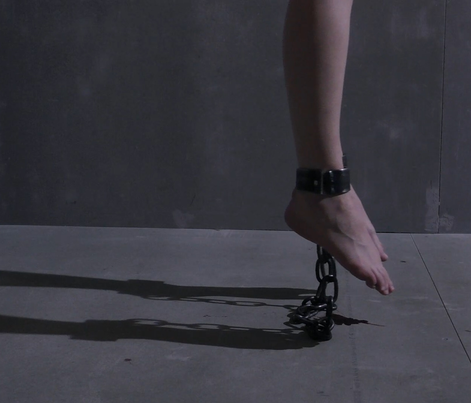 Please chain her feet to the ground, so she won't be able to swing, struggle or kick.