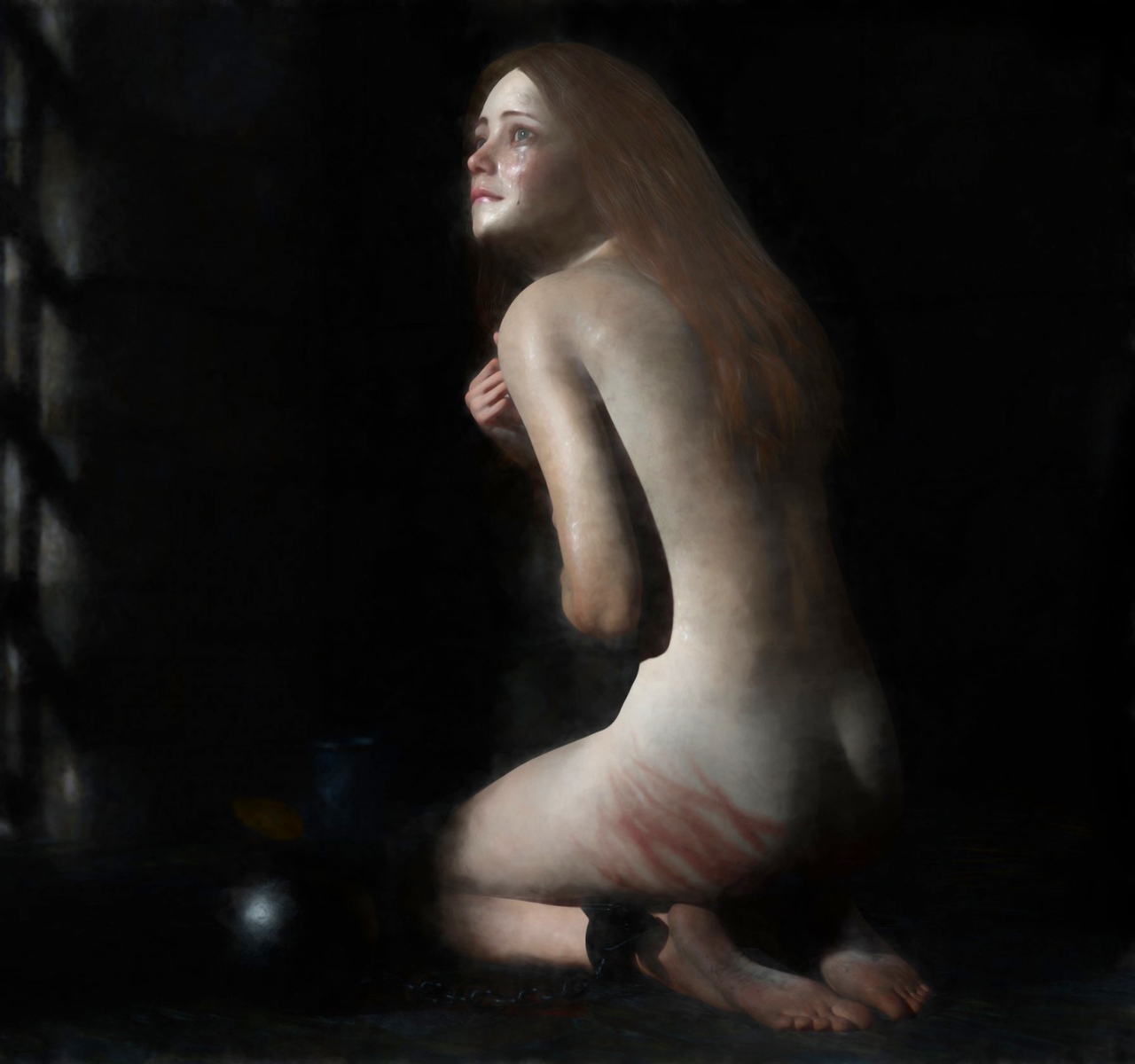 They drag me barefoot through the alleys, my ankle chains shuffling over the cobblestones. There are people staring at me everywhere. I am ashamed and scared. I am being pulled by my handcuffed hands; with the chains between my legs I can only take small steps. I have to be careful not to fall, but that takes my mind off my shame.