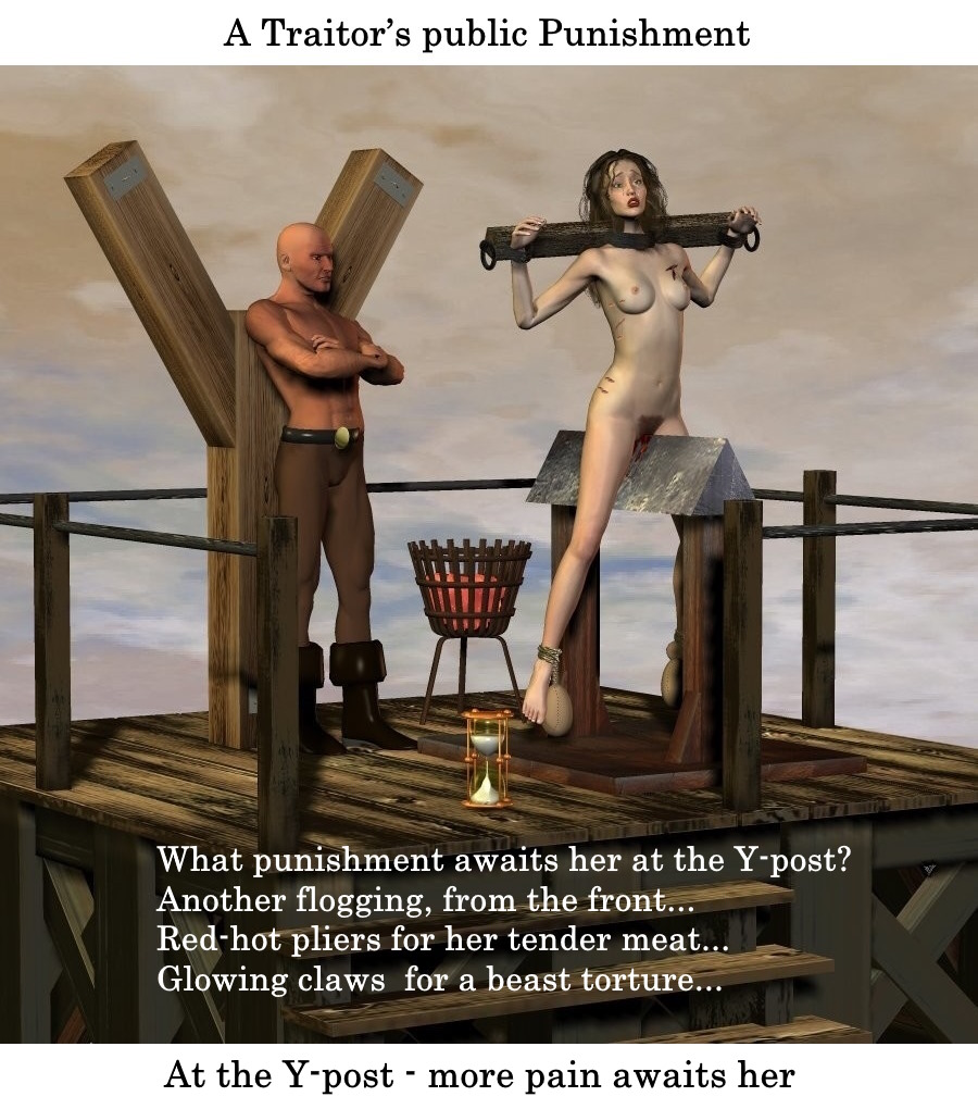 While agonizingly riding the horse, Lady Isabella is shocked to see that the post next to her has been converted from a T-cross to an Y-post. What other dire punishments await her? Will she be whipped from the front again? May be, but I rather think that red-hot pliers are waiting for her tender meat at the Y-post...
