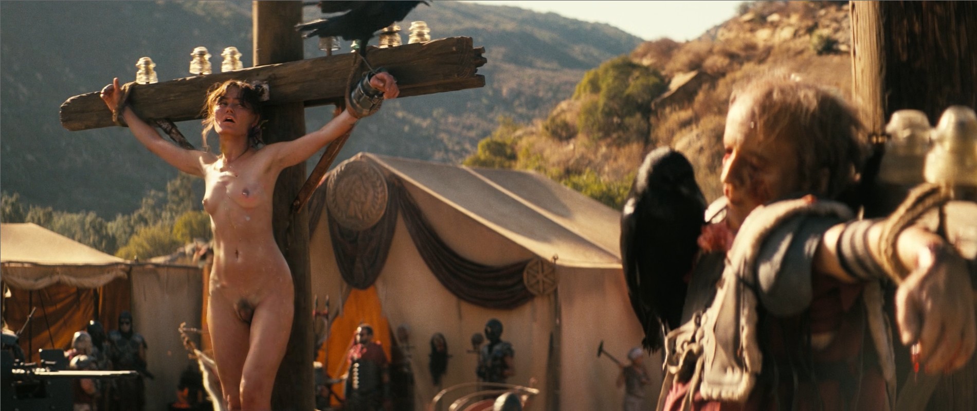 In one of the very few TV shows worth watching, Fallout, now in second season, Lucy has an encounter with the Legion and she ends up rope crucified. Fully dressed, as proper in a PG show.